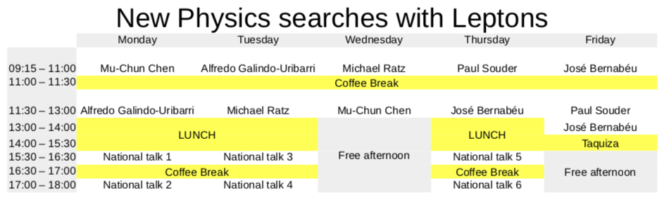 Workshop “Search of new physics with leptons”, to be held in Mexico City at the Physics Institute of Mexico’s National University (UNAM) From Monday 15 to Friday 19, October 2018. Presentations will consist of invited lectures and talks directed to a specialized audience of researchers, postdocs and graduate students. We expect to have 5 lecturers from both theoretical and experimental topics. The main purpose of the workshop is to bring international experts, closer to the Mexican high energy physics community, interested in the search for new physics using leptonic probes. Lecturers José Bernabeu (U. Valencia) Mu-Chun Chen (UC-Irvine) Alfredo Galindo-Uribarri (Oak Ridge) Michael Ratz (UC-Irvine) Paul Souder (Syracuse U.) Invited seminars: Francisco de Anda (TITS) Estela Garcés (IFUNAM) Pablo Roig (CINVESTAV) Carlos Vaquera (U. de Guanajuato) Eduard de la Cruz (CINVESTAV) Alfredo Aranda (U. de Colima)