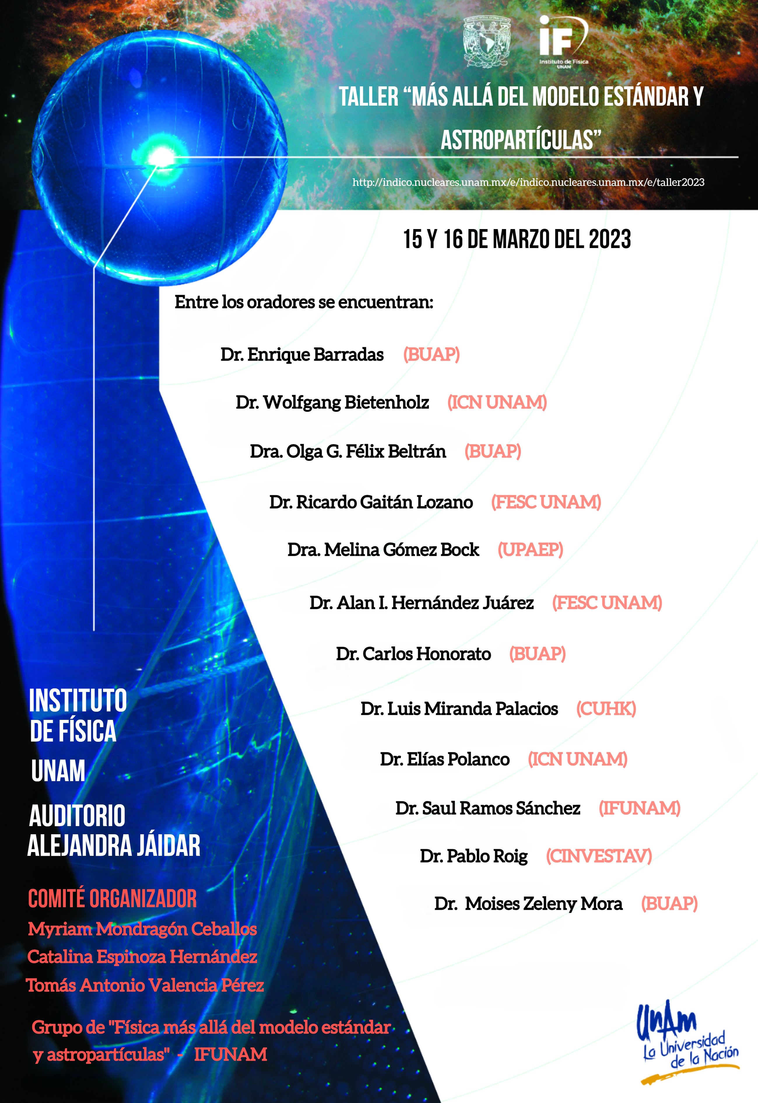 Taller “Más allá del Modelo Estándar y Astropartículas”, a realizarse en la Ciudad de México en el Instituto de Física de la Universidad Nacional Autónoma de México (UNAM). Miércoles 15 y jueves 16 de marzo del 2023.